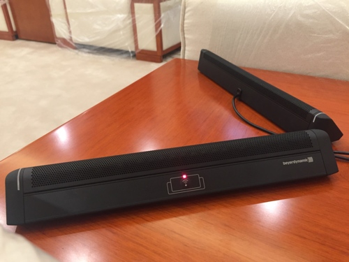 另外在话筒的选择上,由于接待厅在整体装修风格上比较高档,因此常规的鹅颈话筒显得比较突兀,无法和高档的装修风格融为一体。另外话筒的拾音距离较远,鹅颈话筒也无法实现需求。天创为其配置了两只beyerdynamic专利的瑞乐图技术话筒,集成了17只阵列麦克风 ,拥有走廊型的指向特性,保证了宽广的拾音范围和高质的声音。可以满足发言人左右移动或靠近远离话筒时,均能实现理想的拾音效果,最终满足了项目中的使用需求。