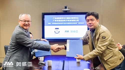 (华南师范大学副校长胡钦太与公司创始人欧俊文先生共建“华南师大奥威亚智慧学习技术创新联合实验室”签约仪式)