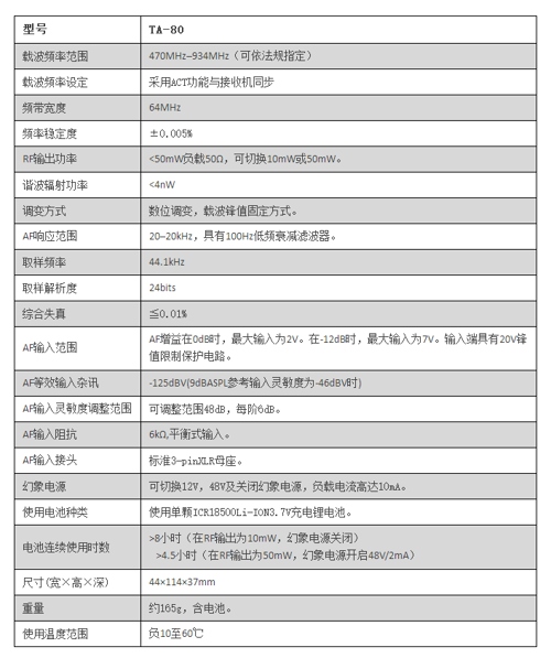 1. TA-80具有平坦及宽广的频响(frequency response)超低综合失真(THD)及底噪(noise floor)快速暂态反应(transient response),超强抗干扰及高讯噪比(S/N ratio)的特性足以解决有线麦克风使用上受到连线束缚的困扰与传输特性的劣化,更解决传统类比式无线传输的品质缺失,能将高级麦克风的音质达成原音完美重现的最佳传输工具。