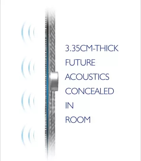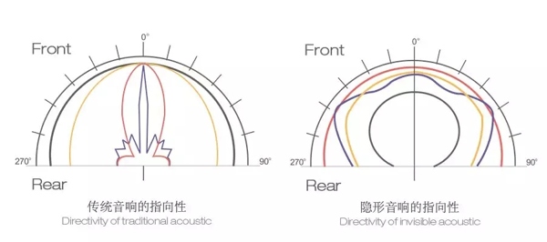面:阿米纳隐形音响采用面声源技术,实现180°全范围声音扩散。不管房间结构如何,人的收听位置在哪里,都能处于立体声音场,房间中处处都是皇帝位。
