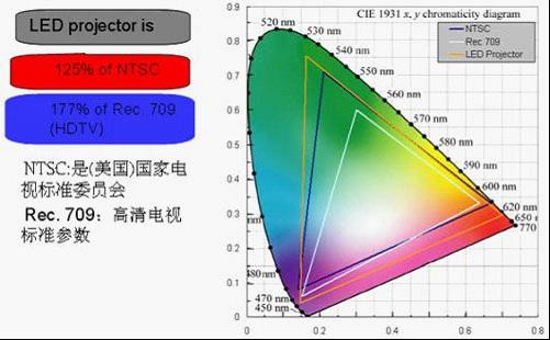 同时由于LED光源的宽色域特性(见图一),使得我们有机会在更复杂的环境中进行应用。若环境光源是通常的冷白光或者白炽灯,那么建议可将色温调整在7500-9300K的范围,使人眼感受的亮度更高、色彩更鲜艳。