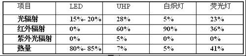 LED光源由于光谱特性,导致在同等亮度的情况下,光源部分产生的热量要高于UHP(见图二)。所以其对于整个投影显示单元的散热设计要求以及环境温度的控制要求也就更高。目前主流的散热方式主要是风冷式和水冷式两种。应该说各有优缺点。风冷式比较传统、成熟,水冷式散热效率略高于风冷式,但是设计难度较高,长期使用的可靠性有待检验。