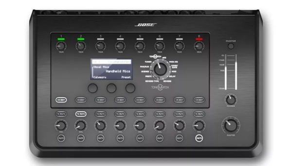 专为表演者服务的小巧的八声道 T8S ToneMatch 混音器,操作直观,触感控件可被点亮、适合舞台使用,显示屏方便查看,场景方便调用。采用强大、先进的 DSP 引擎的ToneMatch处理预设使得音乐家可以轻松控制他们的音乐,包括录音棚般的音效以及重新定义了每个ToneMatch 预设的中、高、低频的 Bose zEQ 均衡处理技术。使用 Bose® L1® 和F1 系统时,T8S 提供完全端到端的音调优化。