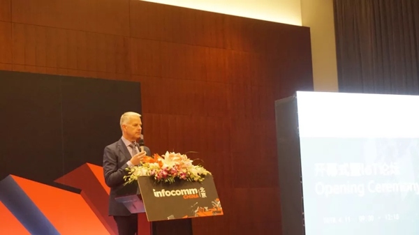 Avixa的CEO David Labuskes在开幕式上致辞。他欢迎到来的嘉宾并提醒大家InfoComm International在去年更名为音视频及集成体验协会(Audiovisual and Integrated Experience Association,简称Avixa)。“更名体现了我们的承诺,而这也正是大家来参加InfoComm China的共同目标——在这一快速增长的市场中为专注于使用音视频和信息技术来解决问题、提升体验以及创造机会的公司及专业人员提供一个信息及资源平台。”Labuskes先生说。