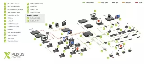 Plixus是一个具有卓越性能、安全性和可靠性最先进的会议架构。这是一个基于数据包的网络,通过一根CAT 5e电缆传输发送高质量的音频和视频等信息,从而简化了整个会议架构。 专用带宽保留用于音频和视频的传输,这样可以让音频和视频能够清晰流畅的播放。并且Plixus在将视频带给每位代表的同时减少了设备和电缆的需求,只用在单元节点上加入视频输入或输出盒即可实现播放。因此,Plixus极大地降低了安装成本并简化了它整个系统架构的维护工作。