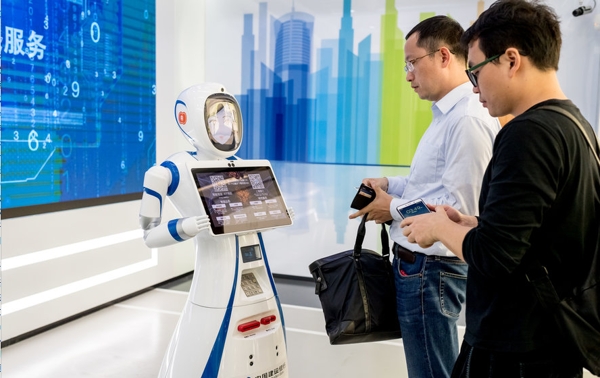 “您好,我叫小龙人,请问您要办理什么业务?”智能服务机器人担负起了网点大堂经理的角色。她可以通过自然语言与到店客户进行交流互动、了解客户服务需求,耐心解答客户简单的业务咨询,并引导客户进入不同服务区域完成所需交易,看上去既显得专业又不失亲和力。