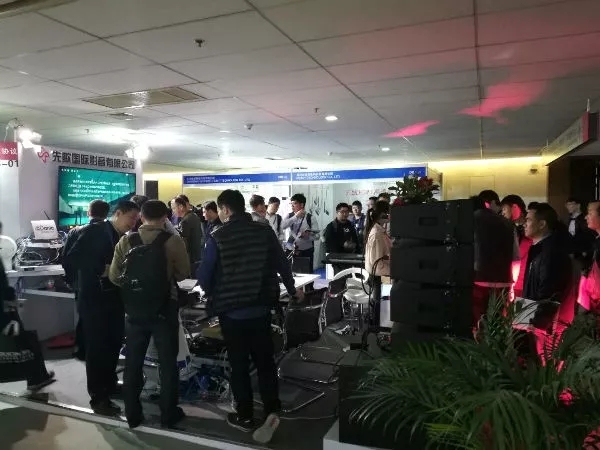 在展会现场,和mission网络音频盒子有源线阵连接在一个系统里,实现音频、视频、灯光、机械在同一个协议中进行控制和信号传输。