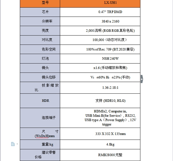 2018年4月13日,JVC杰伟世(中国)投资有限公司正式发布新款DLP电影投影机LX-UH1,配备新研发的0.47”TRP DMD技术的4K 分辨率(3840*2160),配合2,000流明亮度和自动光圈技术实现超过100,000:1的动态对比度,结合100% REC.709(兼容BT.2020)色域和HDR(HDR10&HLG)展现通透逼真的电影级别画质。覆盖上下60%、左右23%的镜头位移和1.6倍短焦镜头,加上紧凑的设计,让安装变得极其容易。这一切让LX-UH1成为这个级别唯一的4K“芯”基准。