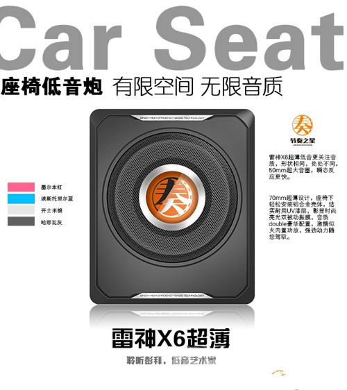 节奏之星X6座椅低音炮提出“我爱色彩"的概念主题,提供的墨尔本红、埃斯托里尔蓝、开士米银、哈纳瓦灰四种配色,摆脱X8超薄贯有雅黑配色,焕然一新X6超薄低音炮大气美观、时尚潮流,为驾驶的生活增加时尚色彩,满足车主们对多元化的个性需求。