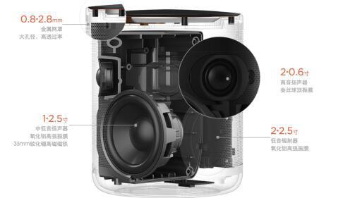 根据猎豹官网上面的资料显示,小豹AI智能音箱配备了两个0.6寸的高音扬声器,一个2.5寸的重低音扬声器,还有两个2.5寸的低音辐射器(俗称被动振膜),在同类产品中可以说是用料比较足的。