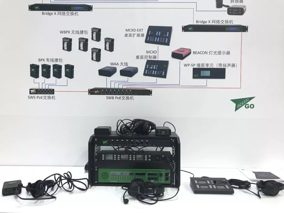 GREEN-GO在本次展会上展示了GREEN-GO品牌的重点品牌产品,基于以太网的数字内通系统GREEN-GO,用于大型现场演出、多功能表演场地、高端租赁设施和广播应用。在此次展会中,易科国际现场搭建了一套小型系统供客户参观了解。