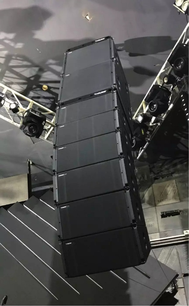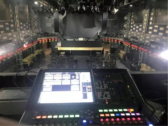 DJ舞台左右两边共吊挂了12只Vera36线性阵列全频扬声器+4只S33线阵列超低频扬声器作为主扩,DJ舞台前方左右两边以及场地后方共使用了6只BSX双21"超低频扬声器作为超低,VIP阁楼位置左右使用了2只B18超低频扬声器作为超低,卡座补声使用了10只M12扬声器,以及使用了8只B18超低频扬声器,大厅补声则使用了4只B18超低频扬声器,DJ返听使用了2只M15扬声器,整个系统共使用了10台PLM12K44四通道数字功率放大器。