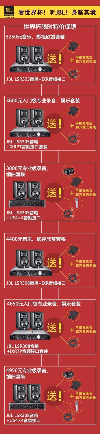 JBL LSR308音箱+TASCAM IXR声卡:促销价:4400元/套(原价:5349元/套),赠送音箱垫+手机充电宝+万能手机充电线。