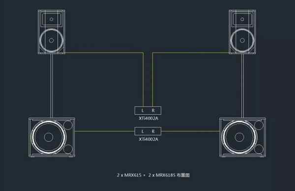 声压级:103-109dB,最远达15米。适用于100人左右,150m²的会议室、阶梯教室、报告厅等场合。2×MRX615+2×MRX618S系统平面布置图:
