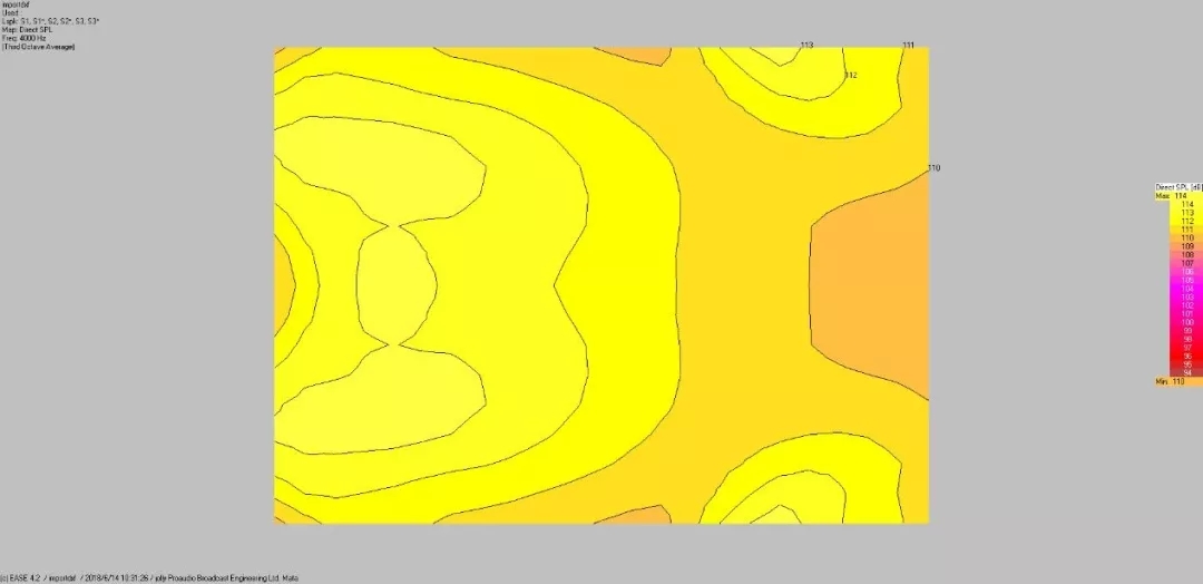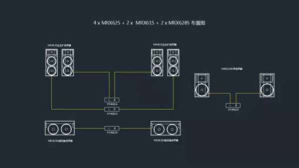 声压级: 110-114dB,最远达35米。适用于400人左右,500m²的会议室、阶梯教室、报告厅等场合。4×MRX625+2×MRX615+2×MRX628S系统平面布置图: