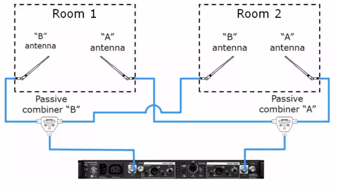 在安装了多对接收天线以增加无线话筒系统覆盖范围的情况下,可以无源合并天线以向接收机或天线分配系统传输单个射频输入。用于此目的时,舒尔UA221,以及设为无源合并模式的PA421B和PA821B IEM发射机合并器都非常适合。除了通道容量之外,这些单元之间的主要区别在于UA221在天线输入之间提供大约15dB的隔离度,而PA421B和PA821B提供大约60dB的隔离度。如果天线位于物理隔离的空间中,例如会议中心的多个房间,则组合器的输入隔离通常不太重要。但是,如果将多个天线安装在同一个物理空间中时,PA421B和PA821B额外提供的输入隔离就变得非常重要。