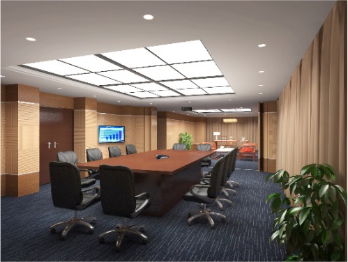 会议室二:领导高端会议室,智能化一键起会,实现会议无人值守,保证会议私密。120寸高清投影+55寸电视、音频扩声、集中控制