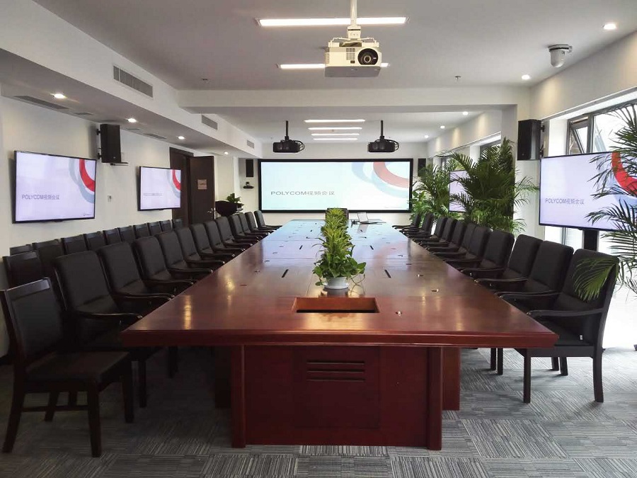 会议室一:高清投影融合、高标清混合矩阵(DM)、嵌入式数字会议话筒(摄像联动)、集中控制